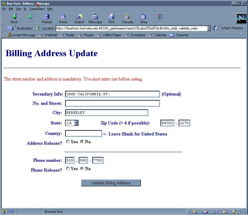 In the current design, a user with only one address must re-enter the information two or three times. Ideally, it should be unnecessary for the user to enter duplicate addresses, based on administrative defaults that use the available address(es) in a logical and consistent way. (Outside of the context of this evaluation of the user interface, I know from experience that when no "Billing address" is available, the "Local address" will be used. However, if no "Permanent address" is available, registration documents are not sent to the "Local address", but instead are sent to the student's departmental office.) In any case, it should be painless for the user to make an address the same as one that has already been entered. This could be accomplished by adding check boxes such as "Make same as Local address" and "Make same as Permanent address".