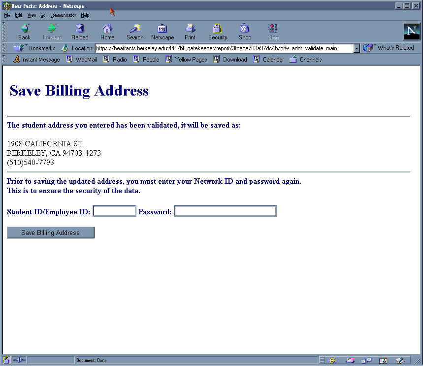I arbitrarily assume that the user begins at the "Bear Links" page. Since several mailing addresses are stored, and the update function for each is similar, I focused on updating the billing address, as representative of any address update task.The following discussion follows a typical sequence of steps and associated screens that the user will see while performing this task.