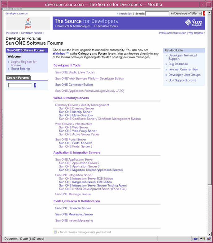 Sun ONE Software Forums, October 2003The following shows the Sun ONE Software forums after the new taxonomy and new look and feel were implemented. The new entry page groups the forums into meaningful categories and corresponds to the developer site information architecture.