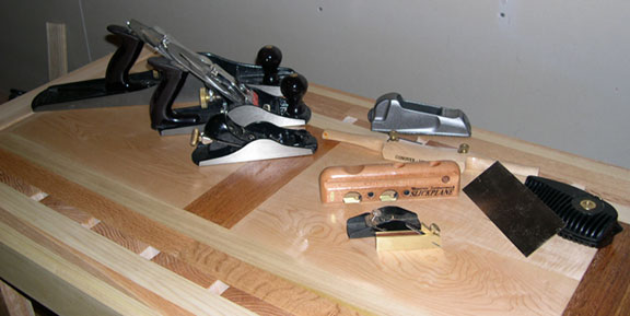 Planes are used to level wood. I mainly use two types of planes - bench and box. Bench planes com in many sizes and have many purposes. I have one I use to joint with. Jointing is the process of leveling a piece of wood with a large plane. The large plane shoe, metal footing, rides on the high surfaces and the cutting blade only takes off from the top of the wood. Using a jointing planeFor large surfaces I recommend planing at a 45 degree angle with the grain, once it is flat at that angle rotate to the other 45 degree angle and flatten. Once both angles are flat run the plane with the grain to ensure it is flat. Edge Jointing - to attach two pieces of wood you need both surfaces to be flush with each other. The long shoe of the plane will create a flat surface. By planing both edges of wood with the grain will create flat surfaces, ensuring a flush fit. Maintenancekeeping the cutting blade sharp is very important. With use the blade will get marred and imperfect. When you see the blade get damaged you need to take the plane apart and sharpen/grind the blade back to shape. When the blade is not honed it will chew into the wood and damage the surface. This takes a long time to correct. |